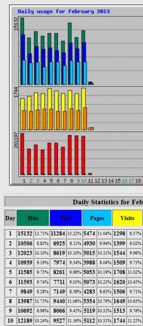 Parallel dazu habe ich natürlich die Webalizer Software für die Webpräsenz  von meinem Provider, die Visits aufzeichnet, wobei jede IP eindeutig anders sein muss und mindestens 30 Minuten nicht auf meine Seiten zugegriffen haben darf. Auf gut Deutsch, eine ziemlich seriöse Softwarestatistik.